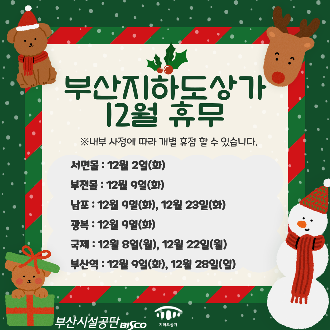 📢 부산시설공단 지하도상가 12월 휴무일 알려드립니다 !